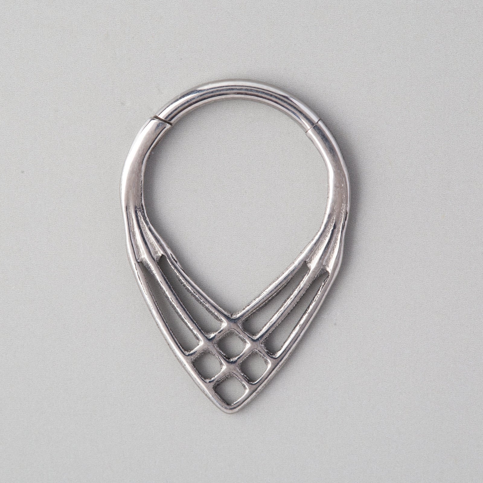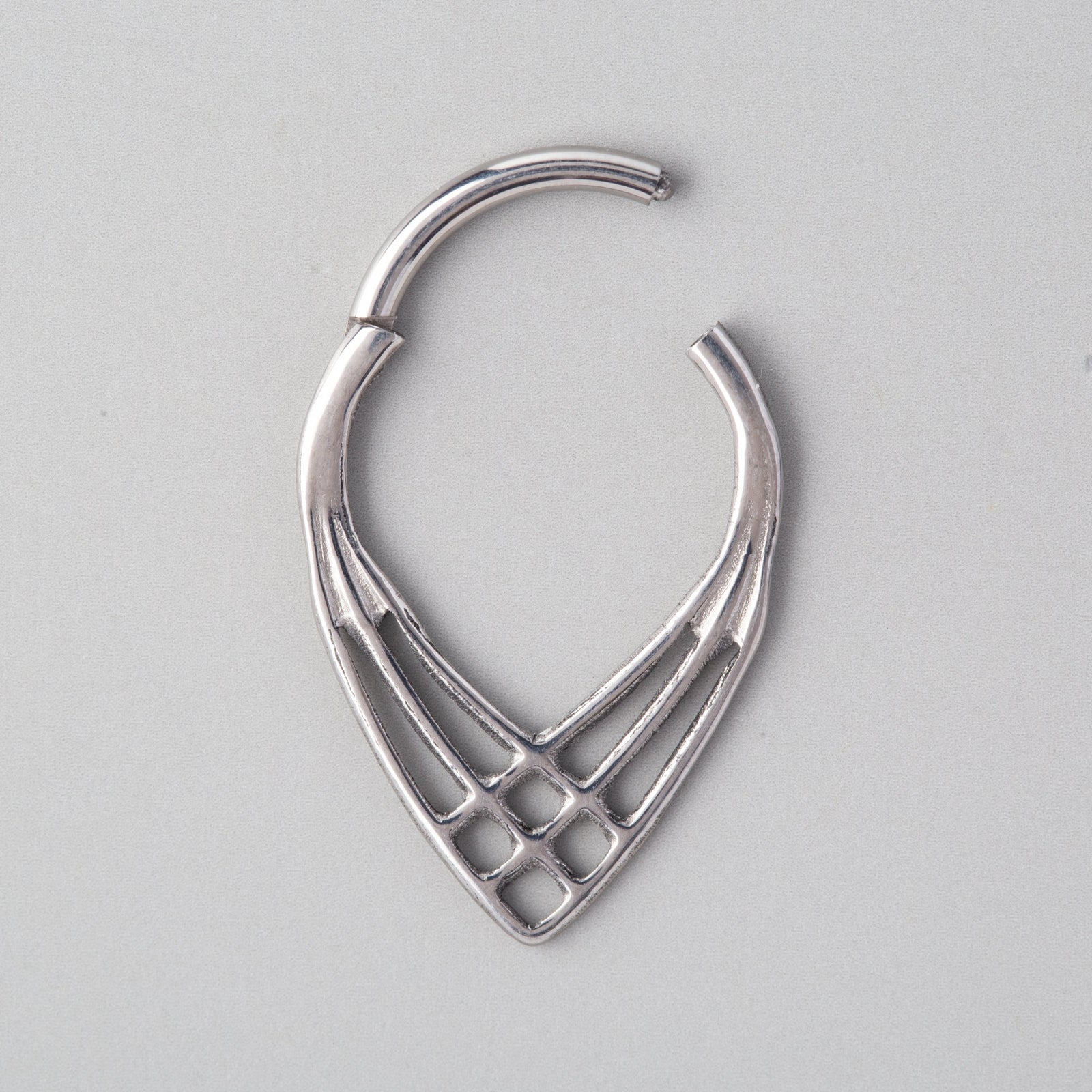 Our 3 Lines Woven Web V Shape Segment Hoop features a seamlessly integrated segment that easily snaps into place, providing a secure fit while offering the appearance of a continuous hoop. The precision-engineered closure ensures that the hoop maintains its shape and integrity, even with regular wear. Available in a large variety of gauges and diameters, this versatile piece is perfect for a range of piercings including earlobes, helix, septum, and more, offering a sleek, polished look that complements both casual and formal attire.